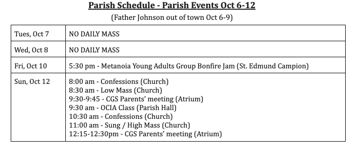 Thanks to donations and pledges received for the Home Campaign, we are able to begin work on some of our more critical renovation projects. This week (Oct 6-10) we will have work crews here to replace the cement stairs from the parking lot to the church. Also this week, Father Johnson will be out of town from October 6-9 for the annual Ordinariate Priests' Convocation, so we will NOT have daily Mass on Tuesday, Oct 7 or Wednesday, Oct 8, while the work is underway. Our weekend schedule will remain the same. (If work is not complete by the weekend of Oct 11-12, we will have our Sunday Masses as usual but you may have to walk from the parking lot up to the driveway to enter the church. Please watch your email and phone for updates.)
