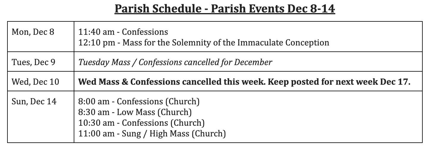 - Tuesday 12:10 pm Daily Mass & Confessions are cancelled for the month of December