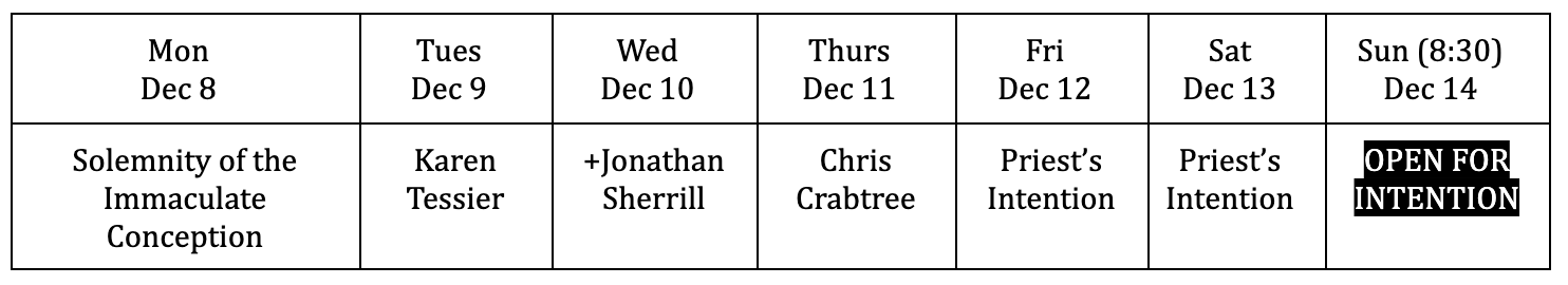 - Wednesday Masses will continue, and we will seek to get coverage if needed (sorry for having to cancel this week!). Note the Christmastide Mass times further below.