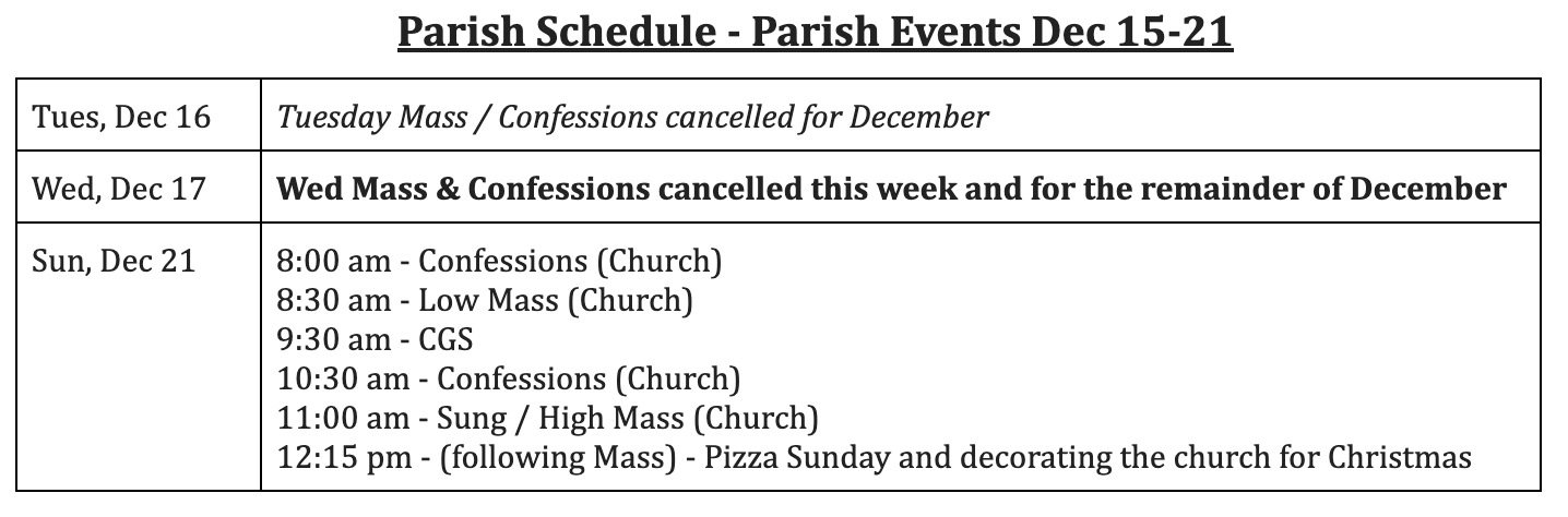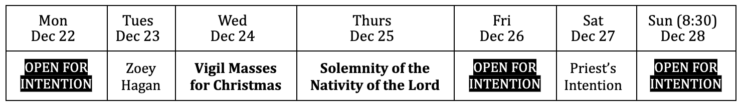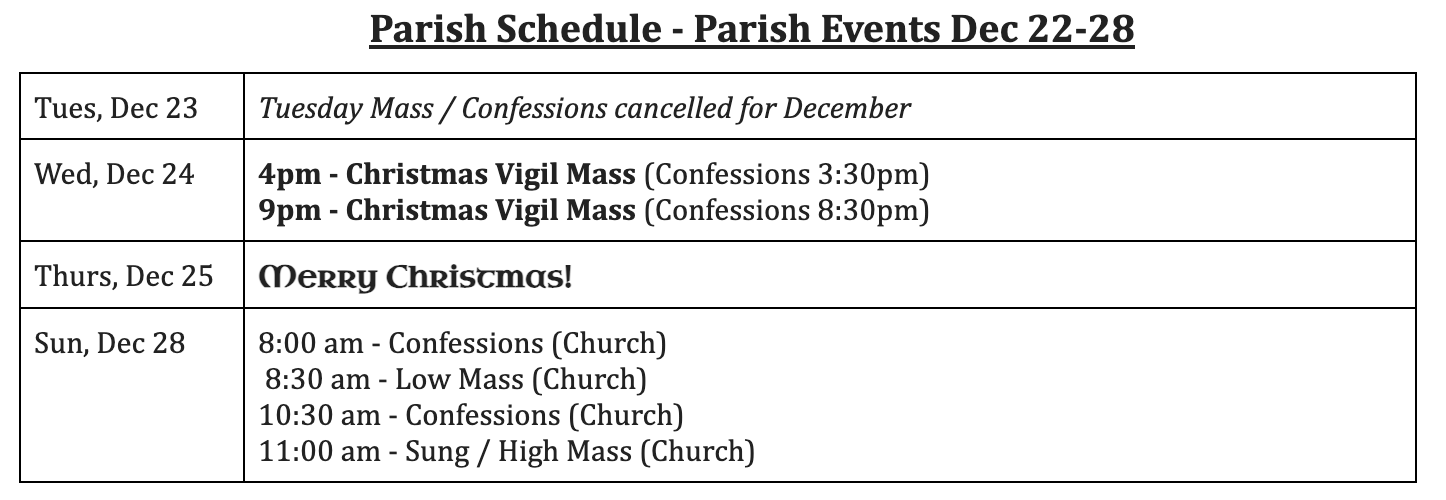 Wednesday, Dec 31 - Anticipatory Mass for the Solemnity of Mary, the Holy Mother of God at 4pm. (Please note this is a Vigil Mass on New Year's Eve - we have listed the wrong day for this Mass in previous Flocknote emails!)