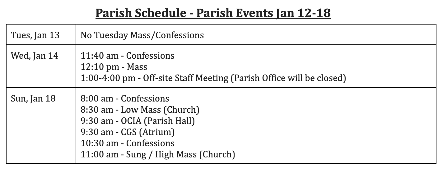 Our Morning of Recollection will begin with Mass at 8:30am, followed by a light breakfast/snacks at 9am, with the presentation starting at 9:30am. We will conclude with a Holy Hour at the conclusion of the Morning of Recollection, with Fr. Johnson (and hopefully at least one additional priest) available to hear confessions.