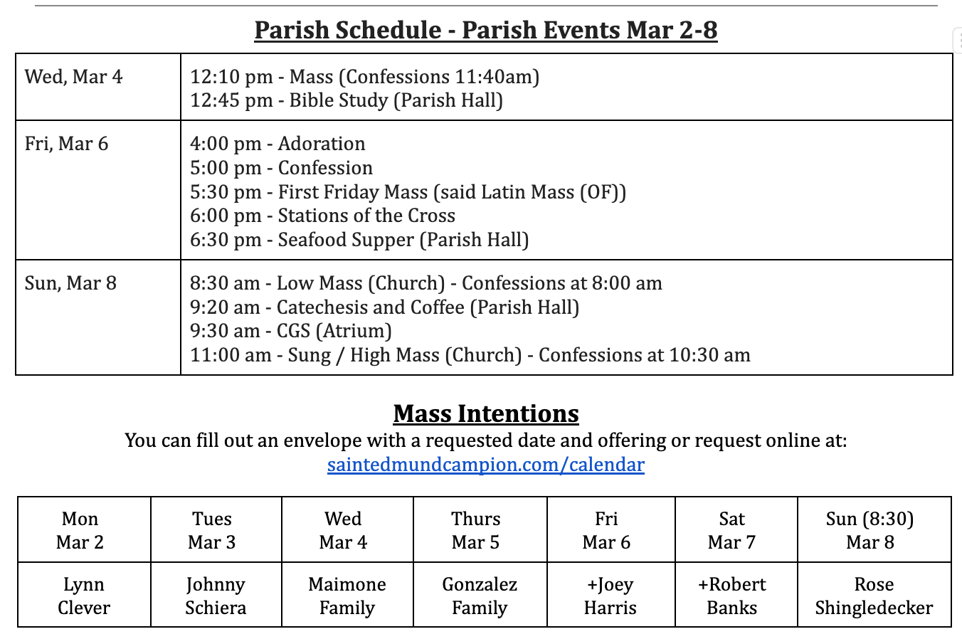 4pm - Mass followed by community meeting and fellowship (location TBA)